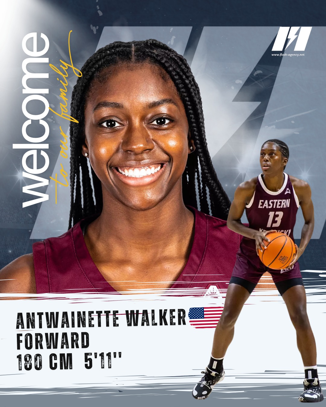 Flash Agency is excited to announce the signing of US Forward Antwainette Walker (180cm / 5'11'') as our newest member. Antwainette is a long, athletic and versatile guard/forward who impacts the game on both ends of the floor, coming off an outstanding career at Eastern Kentucky University and a successful first professional season with BK Gorizont Minsk in Belarus. A two-time First Team All-ASUN selection and ASUN Newcomer of the Year, she proved herself as one of the premier scorers in the conference, averaging 21.0 ppg and 9.3 rpg in 2022–23 and 18.3 ppg in 2023–24, while delivering multiple 30+ point performances including a career-high 38 points. At the pro level she added a Belarusian League championship and All-League Second Team honors, showing her ability to translate her game to the European Flash Agency would like to warmly welcome Antwainette to our family and wish her all the best for the next steps of her professional career!